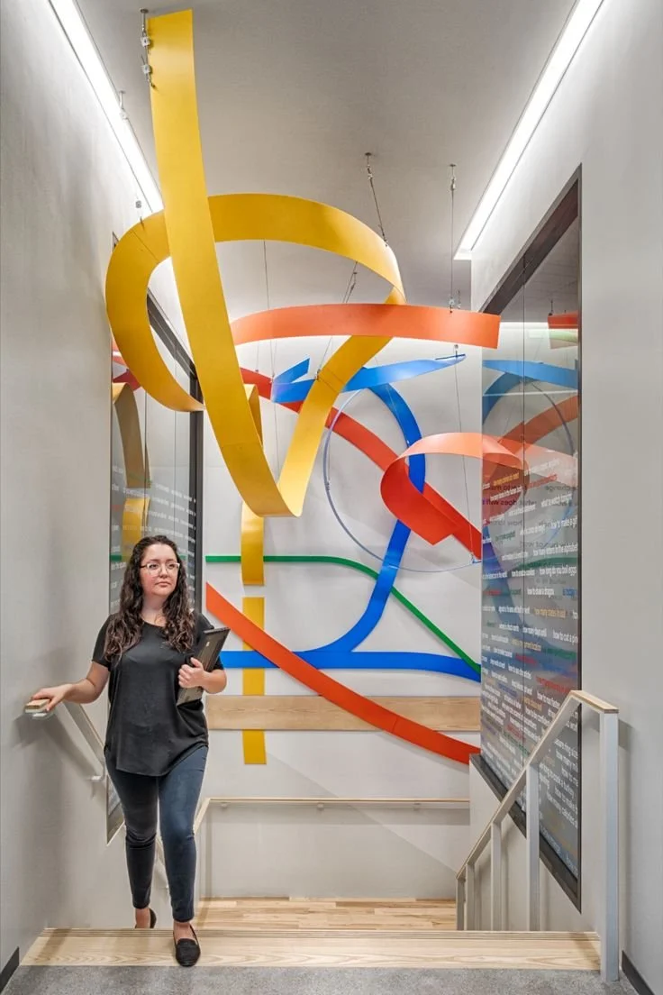 Visual integration through colorful shapes, transparent colored vinyl application, and dynamic figures that invite movement.